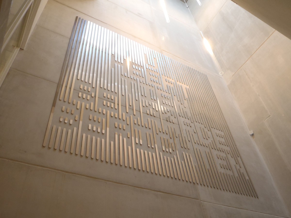 On the concrete wall in the entrance hall of the Synagogue LJG Amsterdam an artwork by Martijn Sandberg can be admired. It is art with a message, realized by Iwaarden in stainless steel.