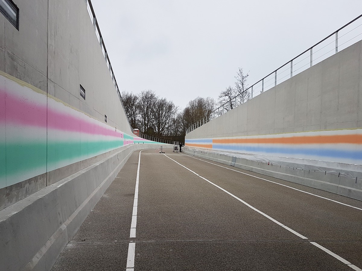 Uitgangspunt in het ontwerp is de horizontale gelaagdheid van de aarde. Twee complementaire kleurbanen worden onderbroken door een complementair nabeeld. Door de snelheid van de bus worden de contouren wazig. Zo ontstaat een ontregelend effect, dat tegelijkertijd opwekkend werkt. De onderdoorgang wordt daarmee een moment van transformatie: het biedt de mogelijkheid tot een kort moment van verwondering over de eigen waarneming.